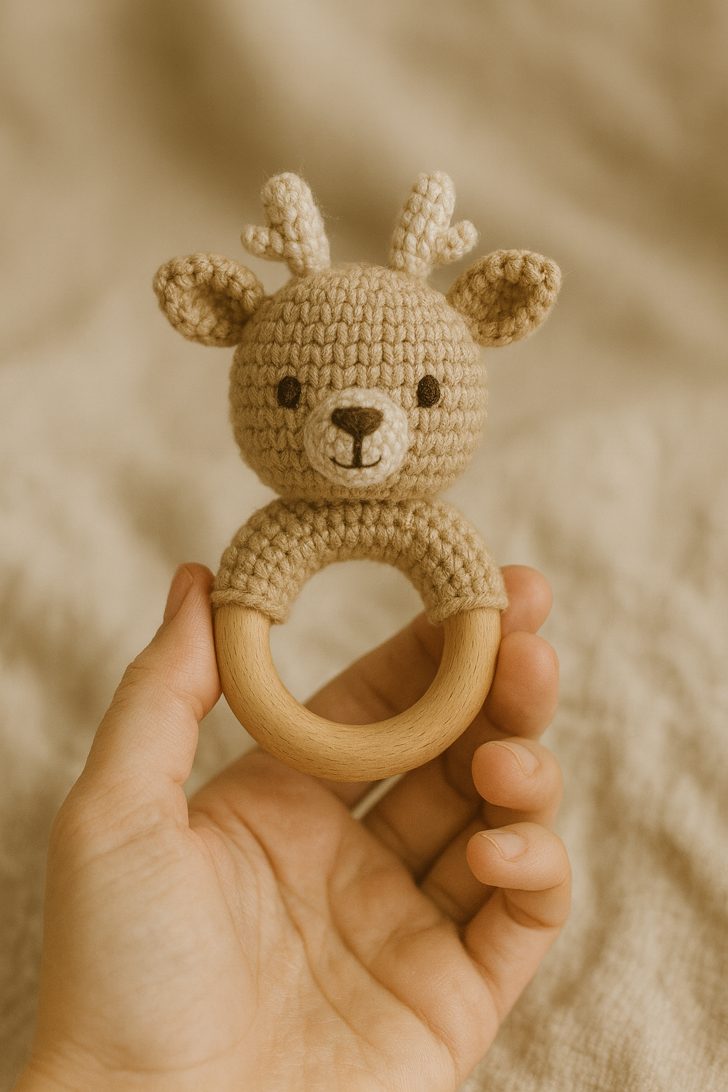Anneau en bois de hĂȘtre non traitĂ© et coton crochetĂ© doux (sans vernis ni BPA). Des matiĂšres naturelles, durables et agrĂ©ables au toucher.